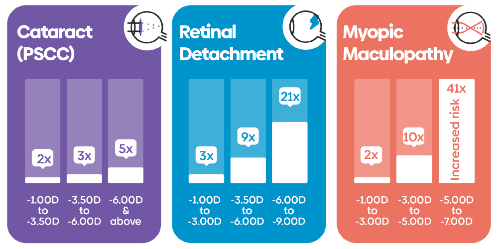 - It is strongly associated with an increased risk of glaucoma, cataract, retinal detachment and myopic maculopathy