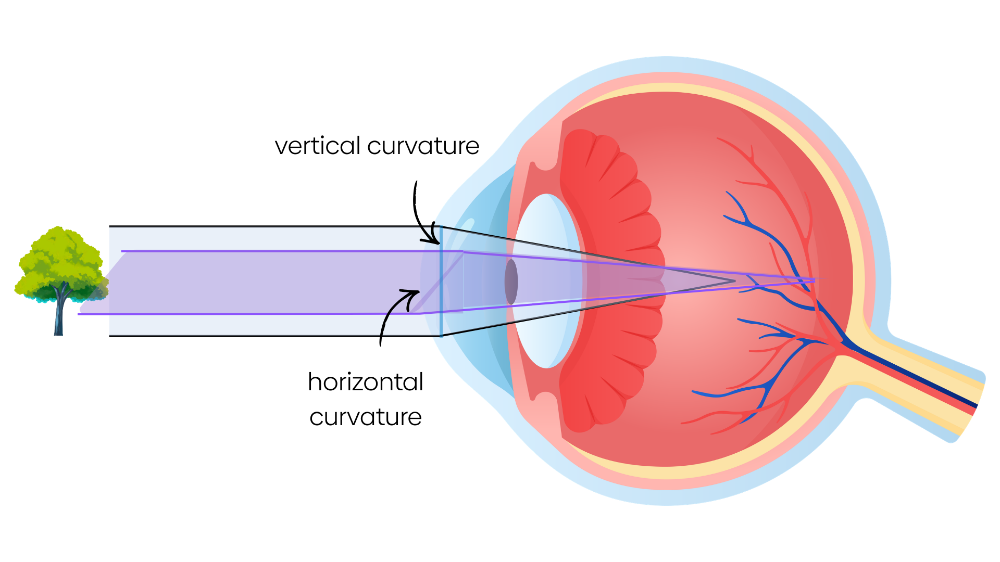 In astigmatism, the front surface of the eye (the cornea) has an irregular curvature, rather than being perfectly round and spherical, like a ball. When the front of the eye has an uneven shape, it affects the way light is bent as it passes through the eyeball. Instead of light focusing evenly onto the retina (at the back of the eye), light becomes spread out and unfocused. This leads to blurred or distorted vision at both near and far distances.
