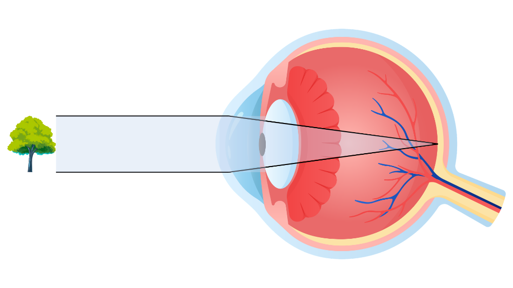 Myopia, also known as near-sightedness, is a type of refractive error in which distant objects appear blurry while near objects can be seen clearly. This occurs when the eyeball’s overall focusing power is higher than required, and is usually associated with longer eye lengths or steeply curved corneas. As a result, light entering the eye is brought into focus too soon – in front of the retina instead of directly on it, resulting in blurred distance vision.