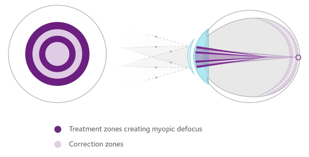 The lens design features a wide central zone where vision is clearly focused, correcting myopia. Ring-shaped treatment zones in the peripheral parts of the contact lens use a special amount of defocus, or a different power. Defocus zones in part of the contact lens signal the eye to slow the rate at which its growing, which is the main driver of worsening myopia over time.7