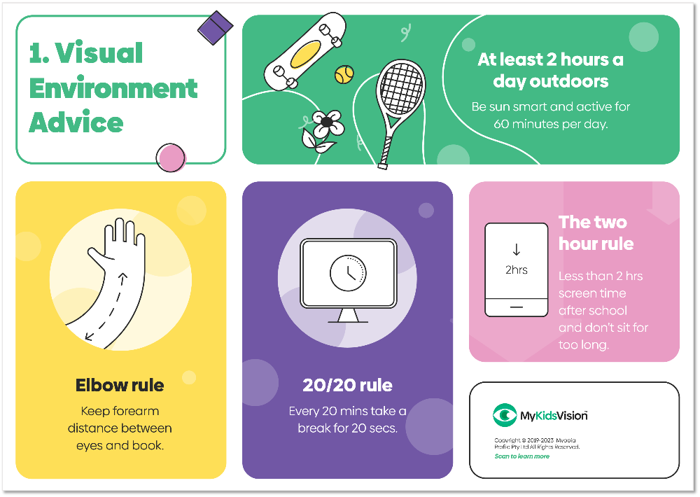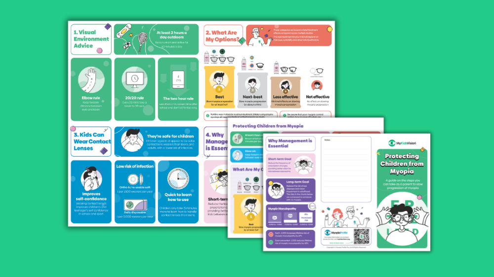 Your child’s eye care practitioner or eye doctor (optician, optometrist or ophthalmologist) may use the following Infographic from MyopiaProfile.com to guide you through a discussion about myopia. These infographics describe visual habits and screen time advice, treatment options, contact lens wear in kids, and why myopia management is essential.