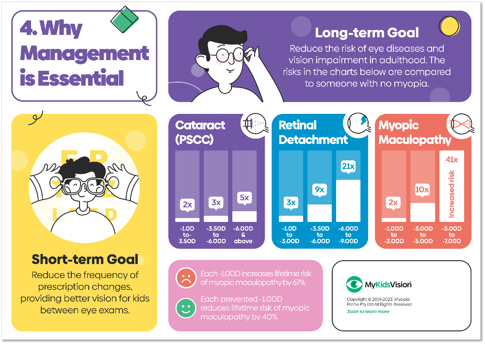 This panel of the infographic summarizes the ‘why’ of myopia management, including the short-term and long-term goals, and the lifetime eye health risks which come with increasing levels of myopia.