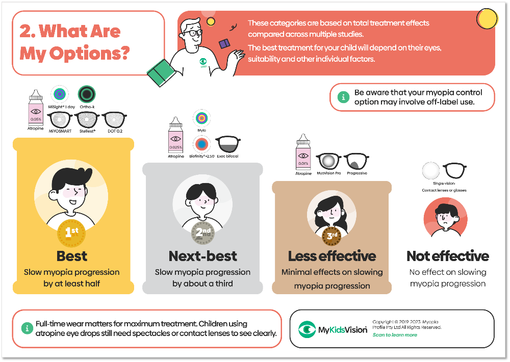 On each podium are groups of treatments which have been shown in their individual studies to slow the excessive eye growth found in progressive myopia by at least 50% (at least half) or around 33% (around one third). Your child's optometrist or eye doctor will be able to provide advice on which treatments are