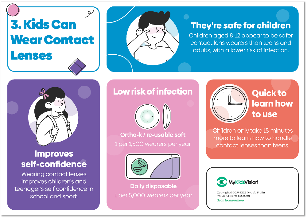 This panel of the infographic illustrates the benefits and safety of contact lens wear in children and teenagers, explaining how they can be safe, successful and satisfied wearers of contact lenses.