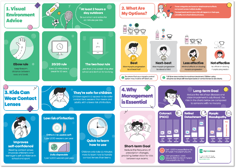 Understanding myopia risk factors, treatment options, risks, benefits and goals of myopia management can be a lot to take in during your child's eye examination. This article explains how a specialized Infographic designed by expert eye care professionals may be used by your optometrist or eye doctor to explain myopia to you and your child.