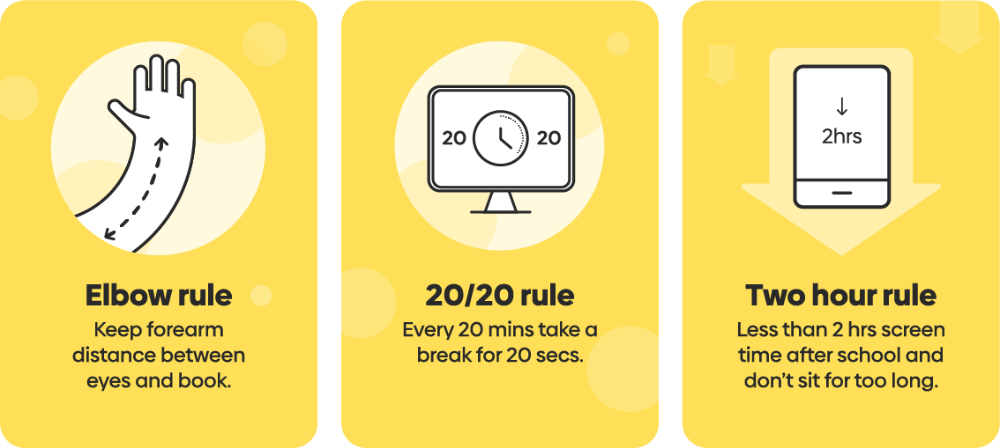 - Children are at greater risk of developing myopia if they view books or screens closer than 25cm, and continuously without taking a break for 45 minutes or more.
